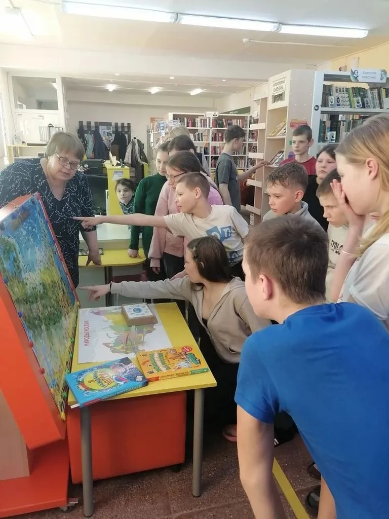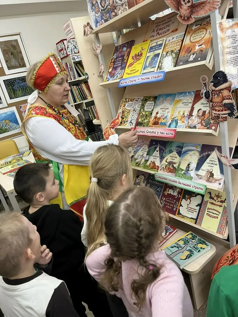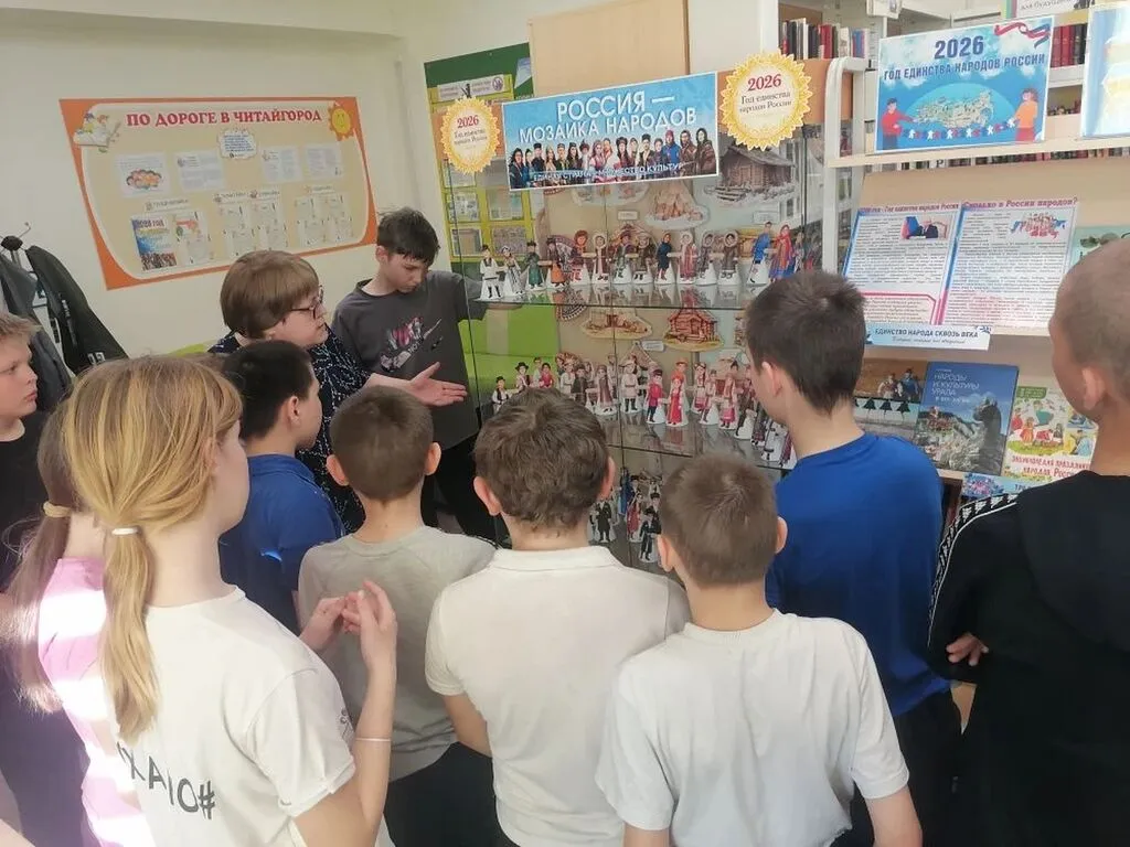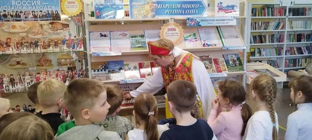 Главное событие - цикл мероприятий под названием «Библио-лабиринт по сказкам народов России» для разных возрастов. Самыми благодарными слушателями стали воспитанники старшей и подготовительной групп детского сада, а также обучающиеся 1–6 классов школы-интерната. Ребята отправились в увлекательное путешествие по выставкам и инсталляциям. Вместе с библиотекарем они узнали, почему 2026 год объявлен Годом единства народов России, увидели выставку-мозаику народов и их жилищ, полистали книги о традициях и кулинарии разных регионов. Особый восторг вызвала выставка вырубных кукол «Костюмы народов России» и коллекция сказок, где, оказывается, живёт та самая добрая Россия. Кульминацией лабиринта стал просмотр мультфильма из знаменитой серии «Гора самоцветов». Дети и школьники с удивлением обнаружили, что всем известная «Курочка Ряба» существует у самых разных народов нашей страны. Но главное открытие ждало их впереди: обсуждая сказку, ребята вместе с библиотекарем пришли к важному выводу. Оказывается, эта простая история учит нас не отчаиваться в любой ситуации и уметь преодолевать трудности. А ещё — что для настоящего счастья иногда нужно не «золотое яичко», а самое обычное, простое куриное яйцо. Этот глубокий смысл, понятный каждому ребёнку, помог юным читателям взглянуть на знакомую сказку совершенно новыми глазами.